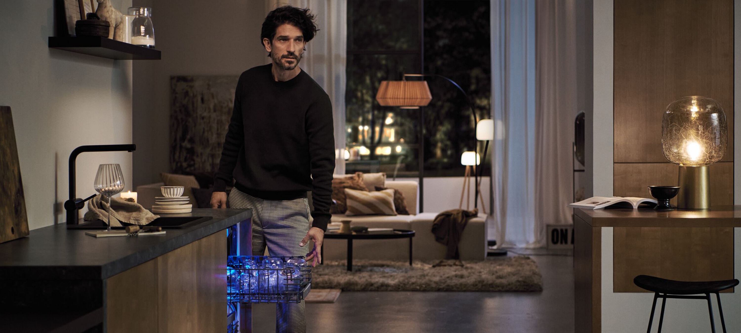 timeLight, infoLight und side­Light signalisieren Ihnen wichtige Informationen wie Programmsta­tus und Restlaufzeit. Die Anzeigen werden dafür zum Beispiel auf den Küchenboden projiziert oder leuchten den Möbelspalt neben dem Geschirrspüler aus.